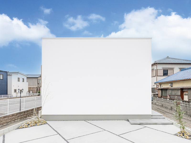 ✔正面に窓がない、真っ白な塗り壁に植栽が映える洗練された外観。