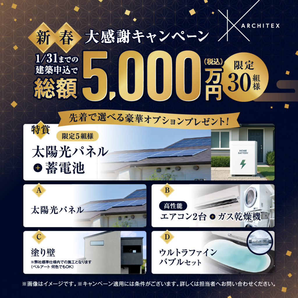 総額5000万円(税込み) 1/31(土)までの建築申し込みで【限定30組様】