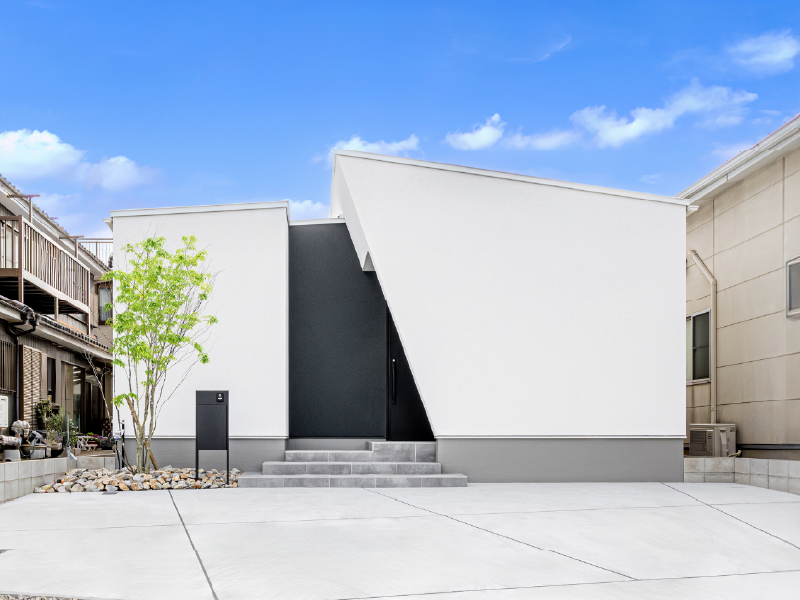 ■白と黒の対比が美しいファサード。通りに面した玄関は斜め壁で家の中が見えない設計。