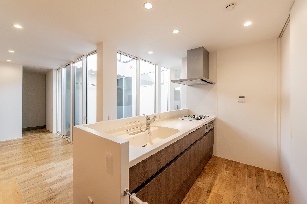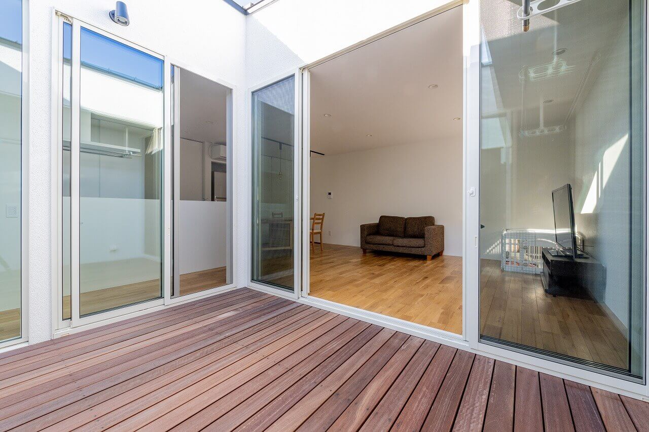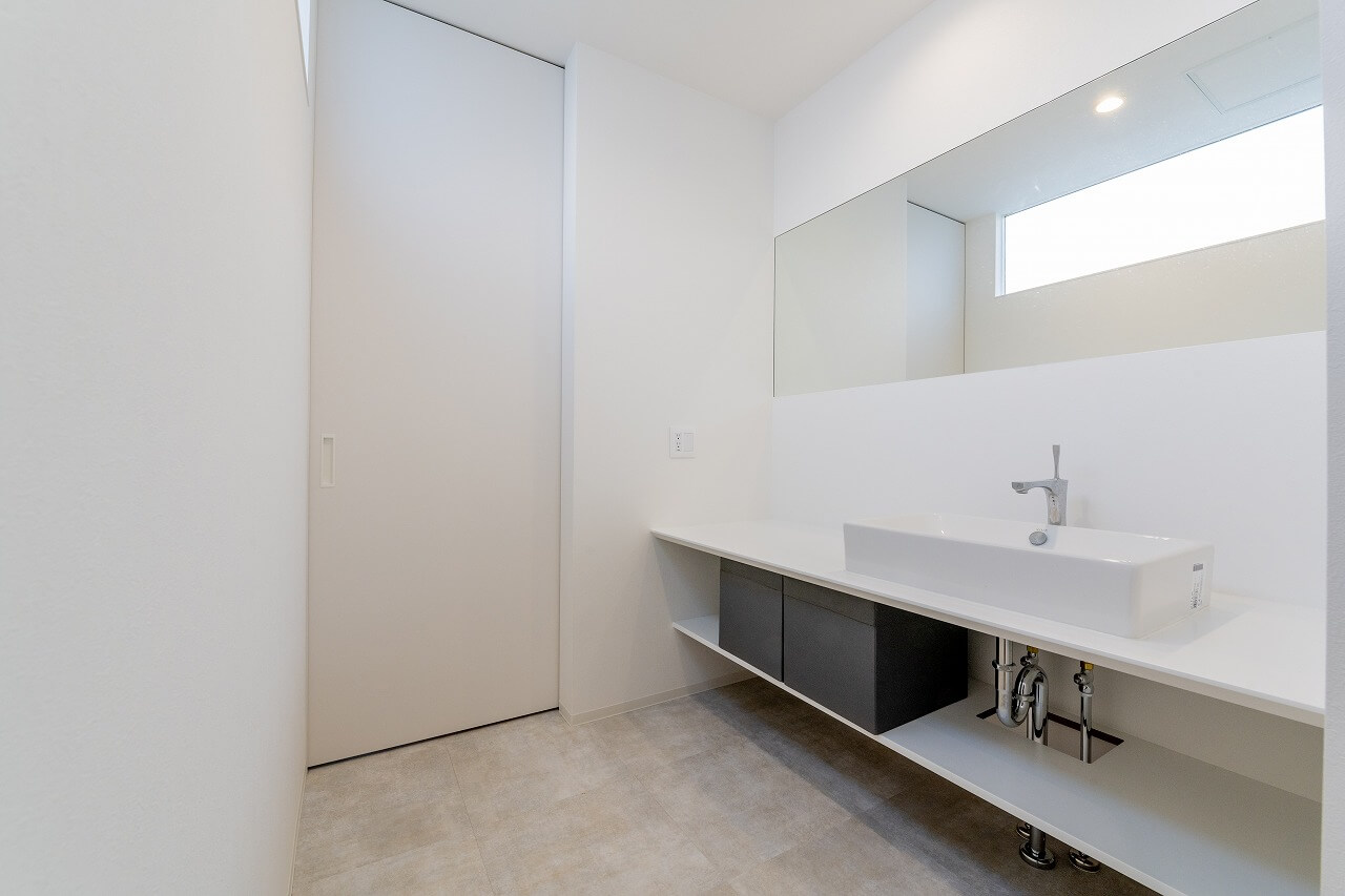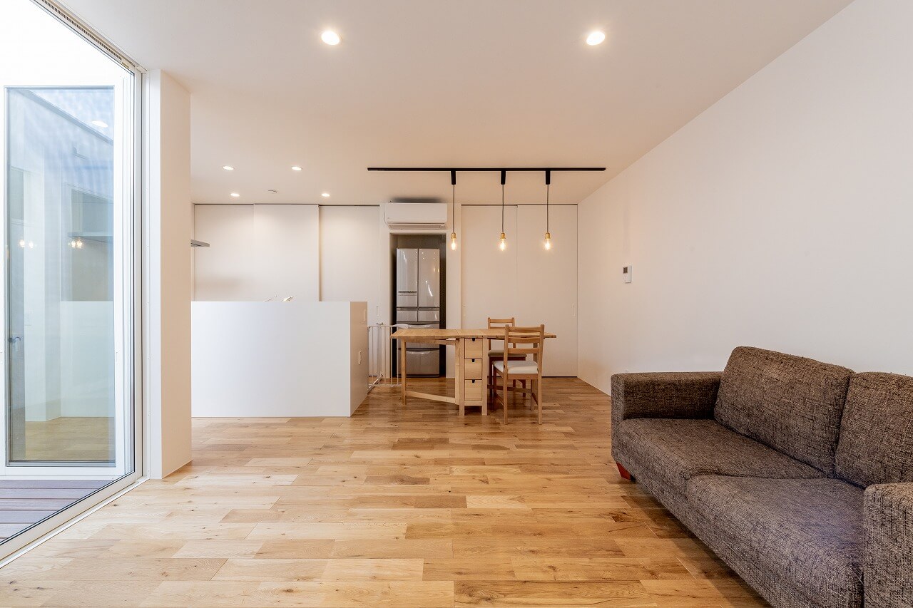 黒のガルバリウムの外観に合わせ、玄関の色合い黒にすることで統一感が生まれ、シックな印象に。 また、室内の家具を配置をスッキリさせ、動線を確保することで、天井高の窓や扉から解放感が生まれます。 ナラ材が使用された床は、「トラフ」という独特の木目が現れ、味わいのある室内にみせてくれます。 #4234037