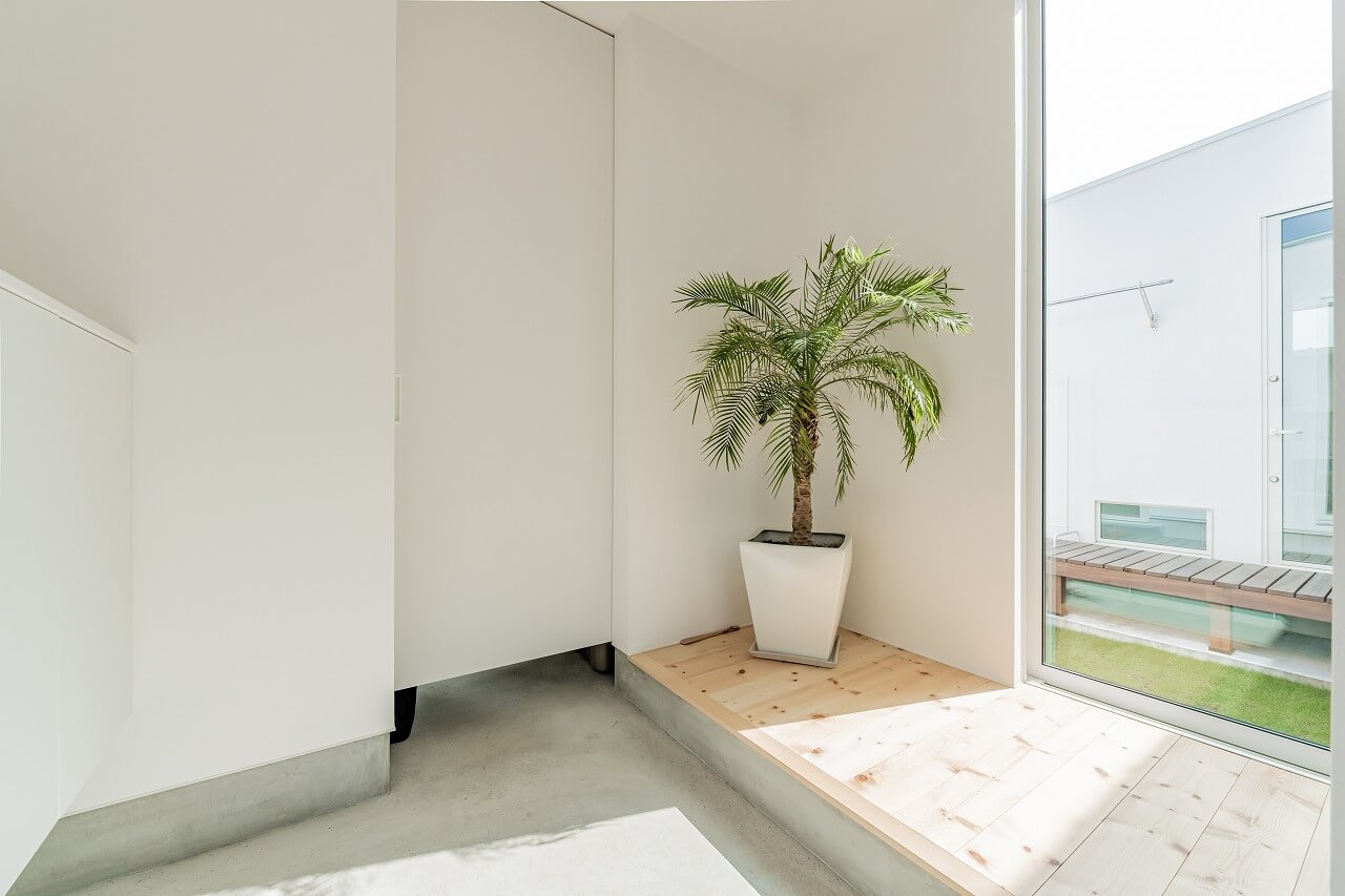 玄関にはいるとアウトドア用品をたっぷりしまえる土間収納があります。扉付きなので視界を遮り、すっきりとみせます。