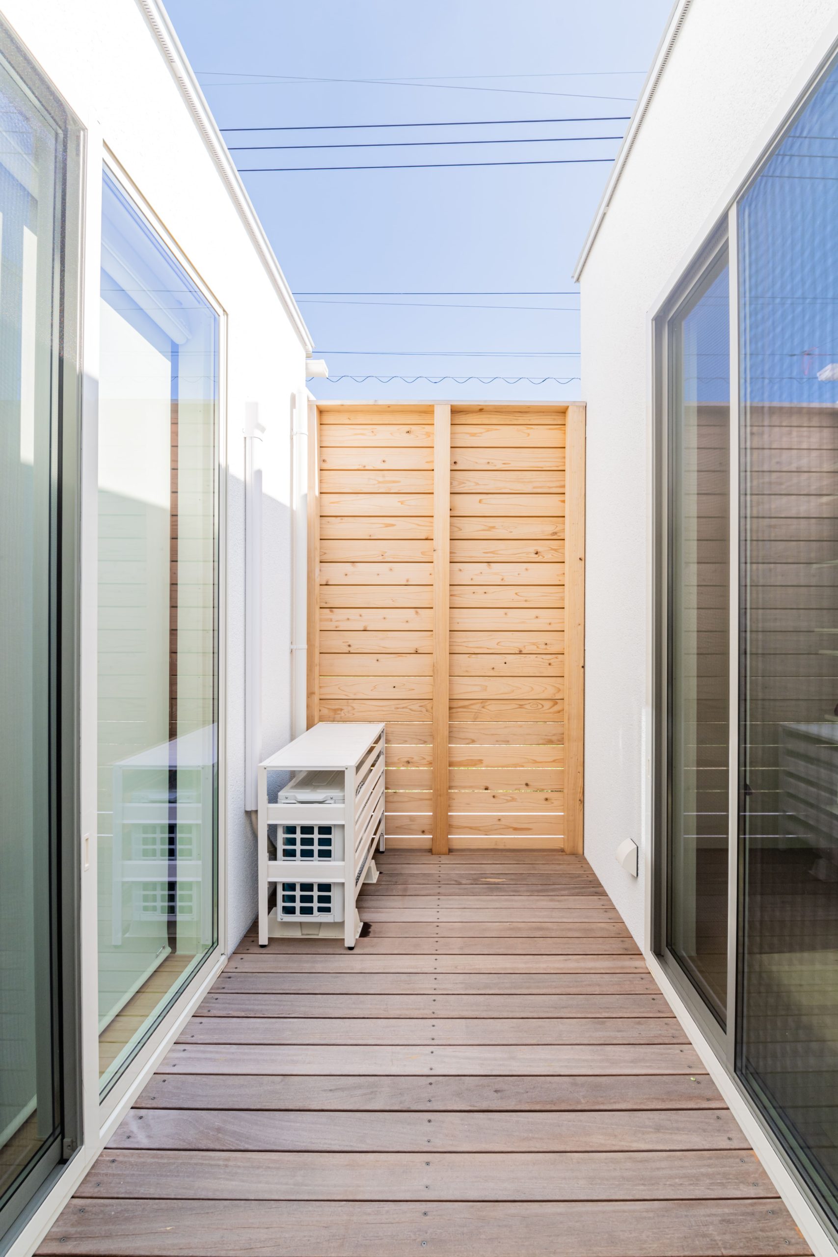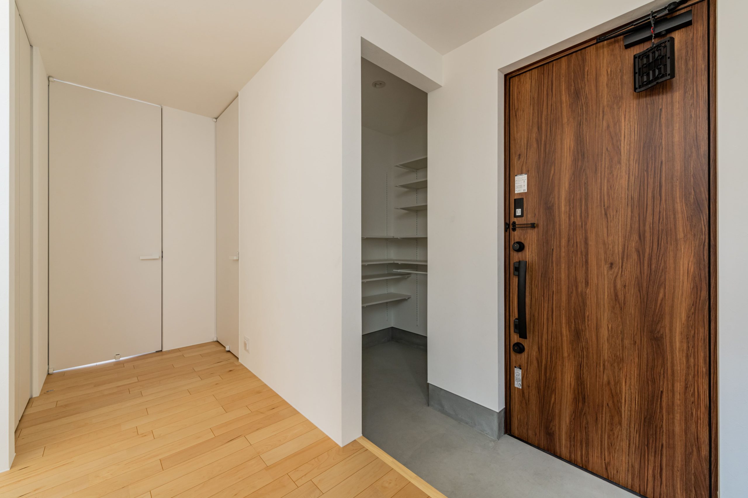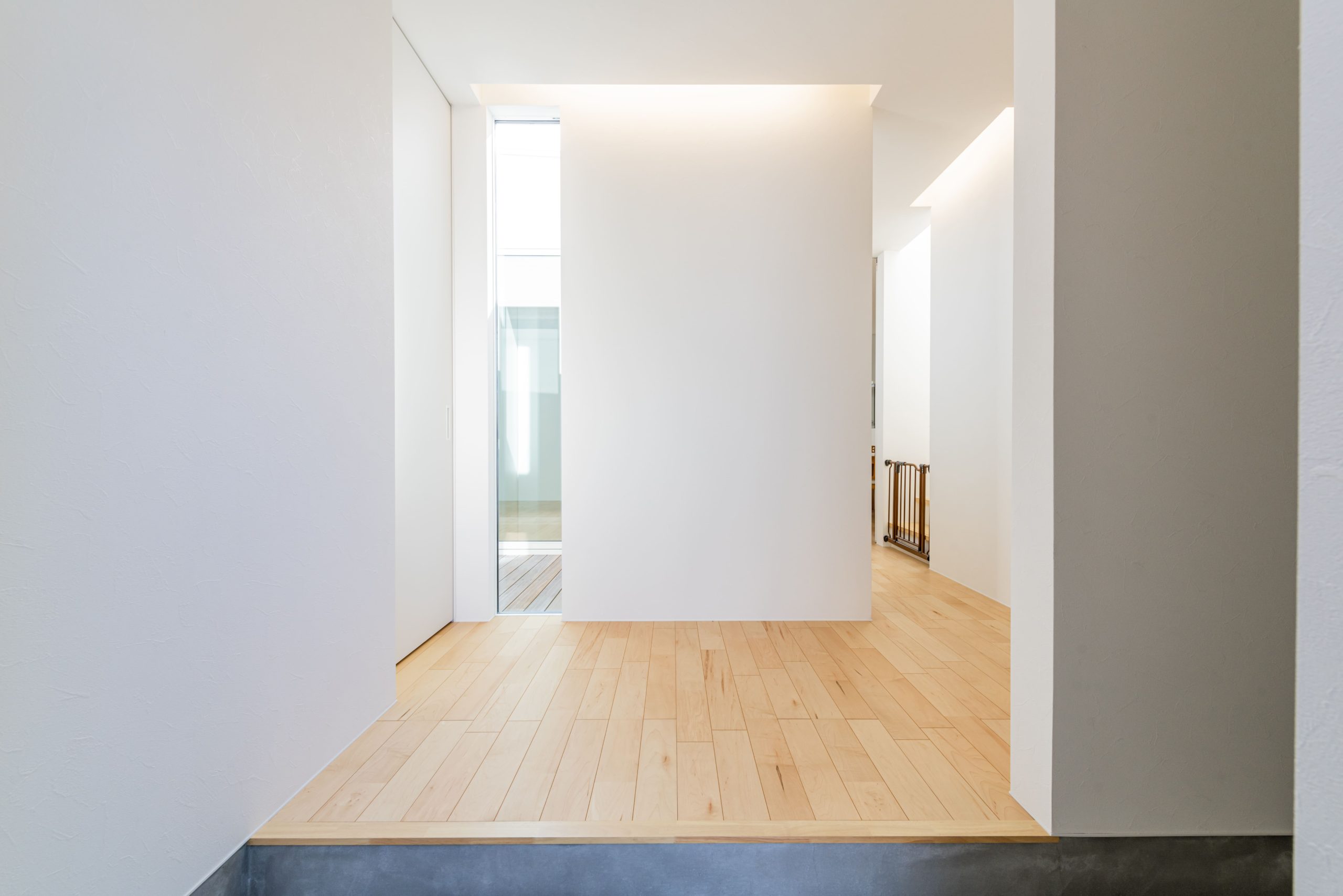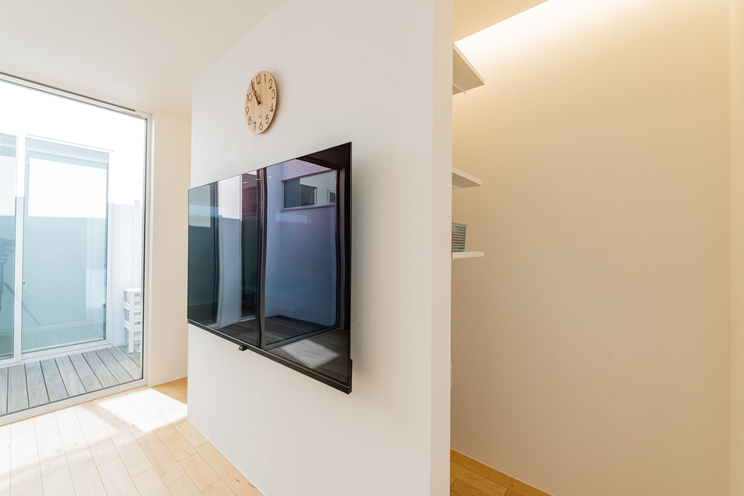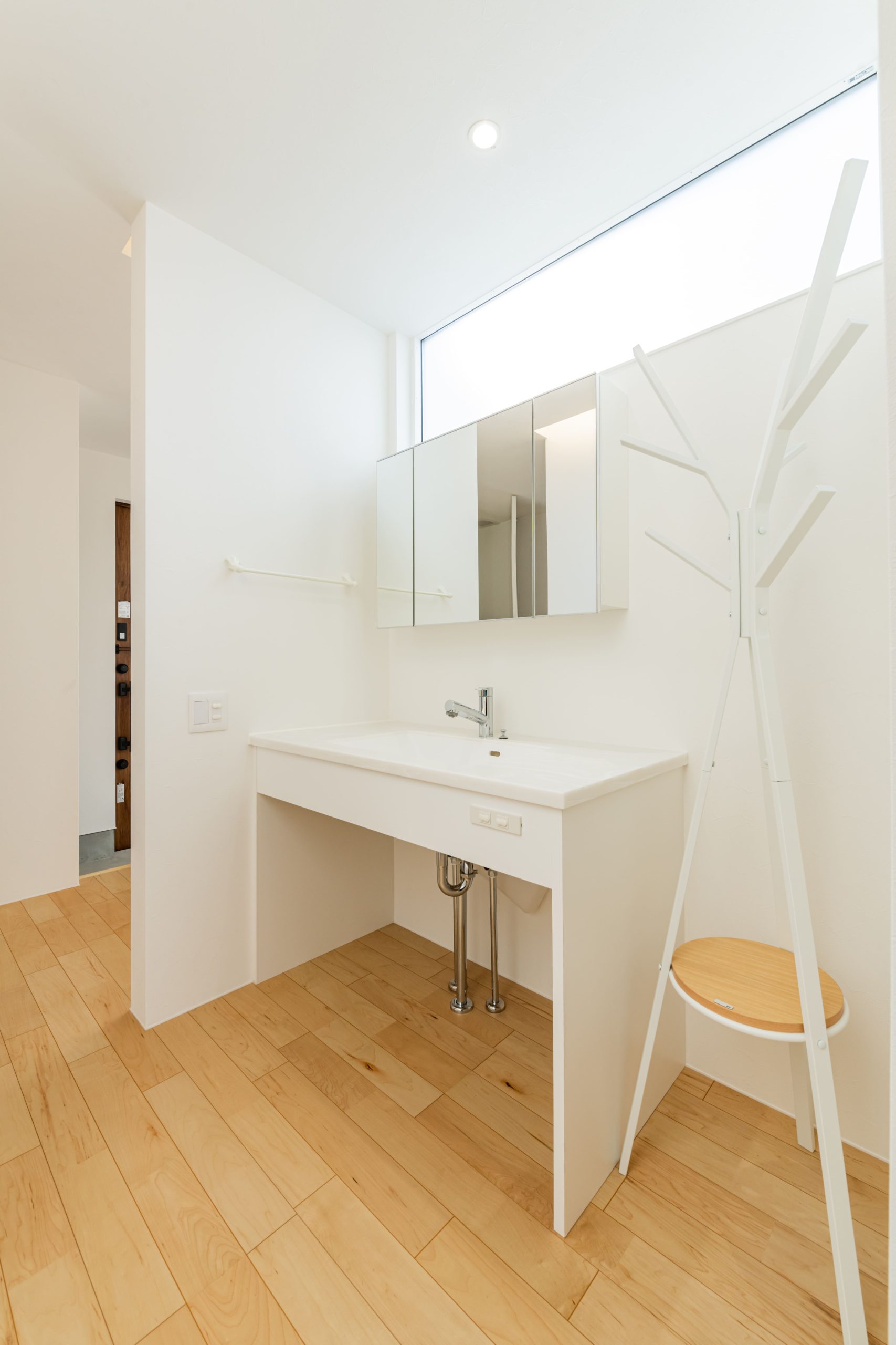 「はめ込み窓」から中庭の光を取り込み明るい玄関。 家に入ってLDKへ向かう途中に設けた洗面台。 帰宅してすぐに手を洗えるほか、来客がリビングに入る前に自然に手洗いができる動線となっています。 また、壁掛けテレビの裏には収納を設置。 テレビの配線やリモコンなど散らかってしまいがちなものをさっと隠すことができるので、すっきりとした部屋を保つことが出来ます。 #5201199