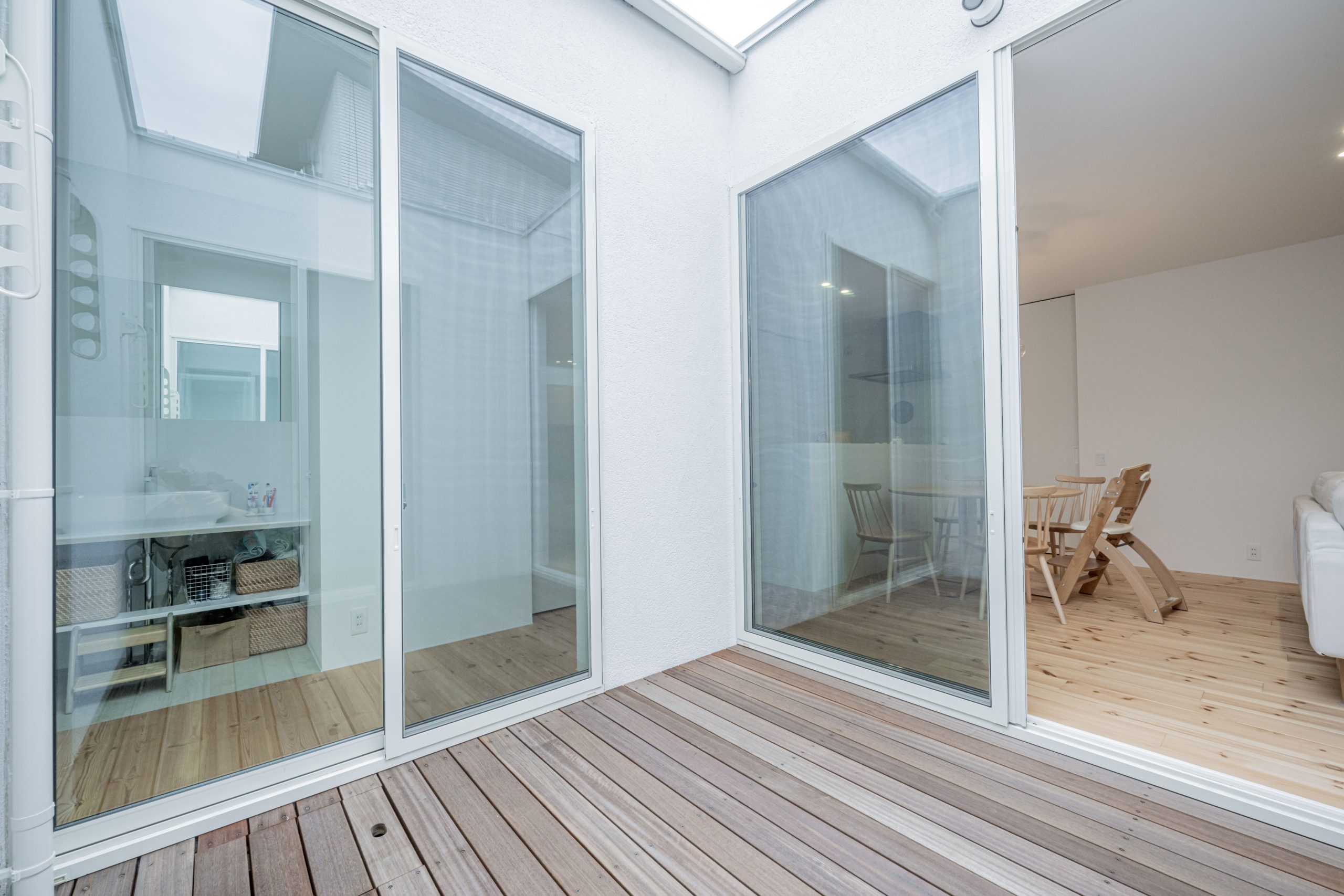 外観は白の塗り壁をベースに、玄関部分に木目調を取り入れることで、やわらかい印象に仕上げました。中庭を囲む設計で、光と風を取り込みながら、家事動線もスムーズに。どこにいても家族の気配を感じられる、心地よい空間が広がります。