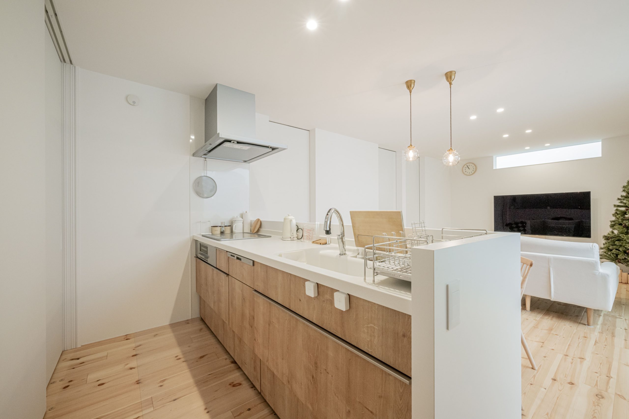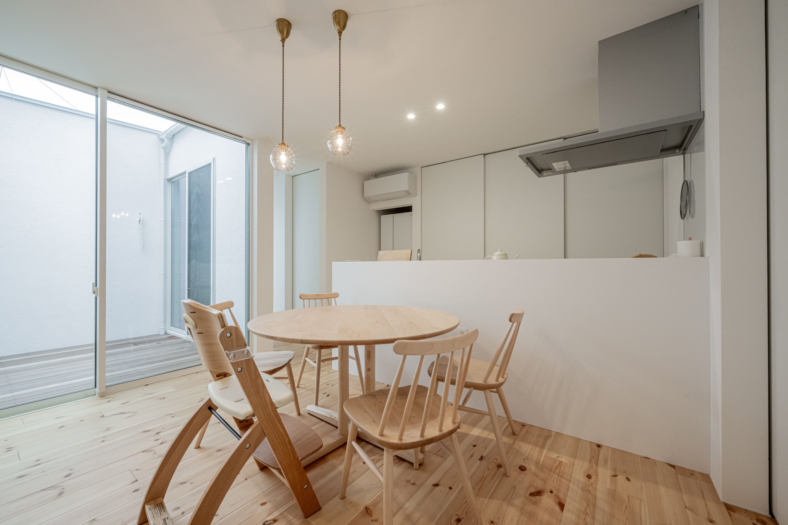 ダイニングにはお施主様こだわりの丸テーブルを配置し、ペンダントライトを採用することで、食事の時間がより温かく、おしゃれな雰囲気に。日々の暮らしを大切にしながら、シンプルな中にこだわりが詰まった住まいになりました。