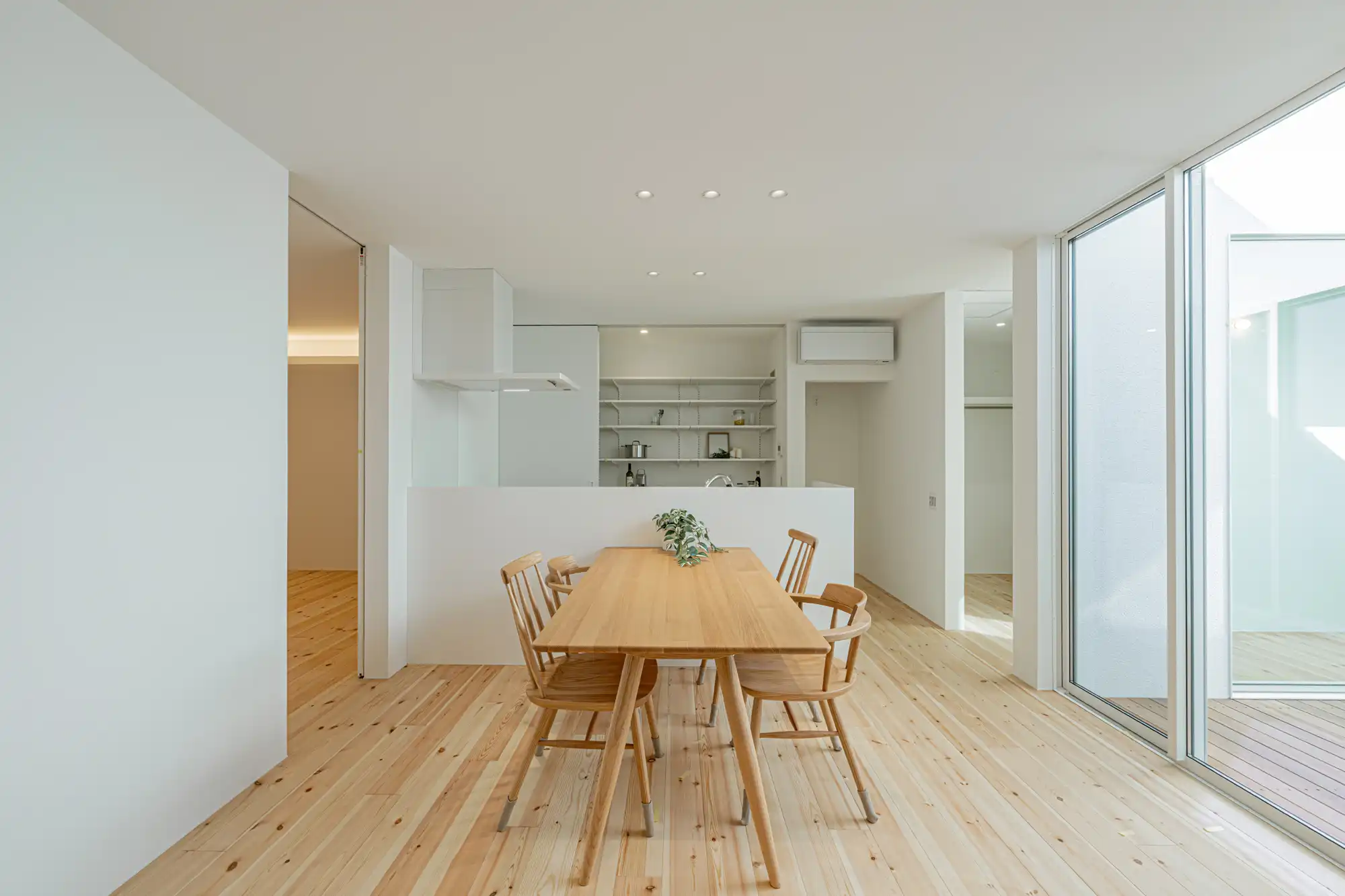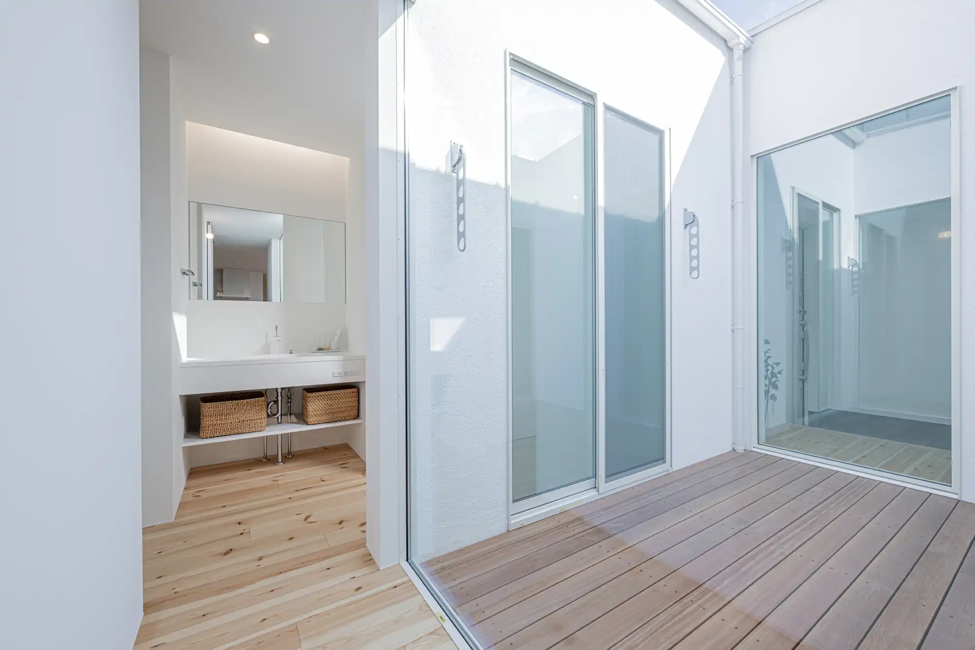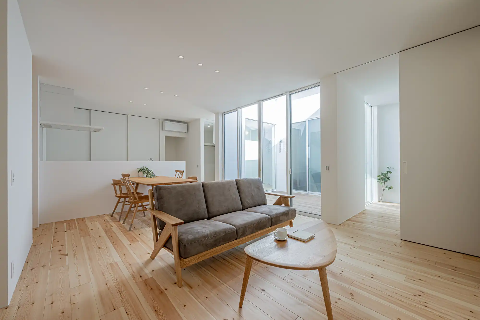 中庭を囲む無駄のないコンパクトな「ロの字間取り」が特徴で、高い建物に囲まれながらも、北側中庭からの反射光で家全体に明るさと開放感を享受できます。脱衣室から中庭、FCLへの動線により、短い洗濯動線を実現しました。外観は斜め壁がアクセントのSIらしい洗練されたデザインです。内装は白を基調に、パイン材が温かく映えるシンプルな家。ホームアーキの照明や間接照明で空間を演出するほか、生活感をさりげなく隠す玄関のカーテンも魅力的なポイントです。