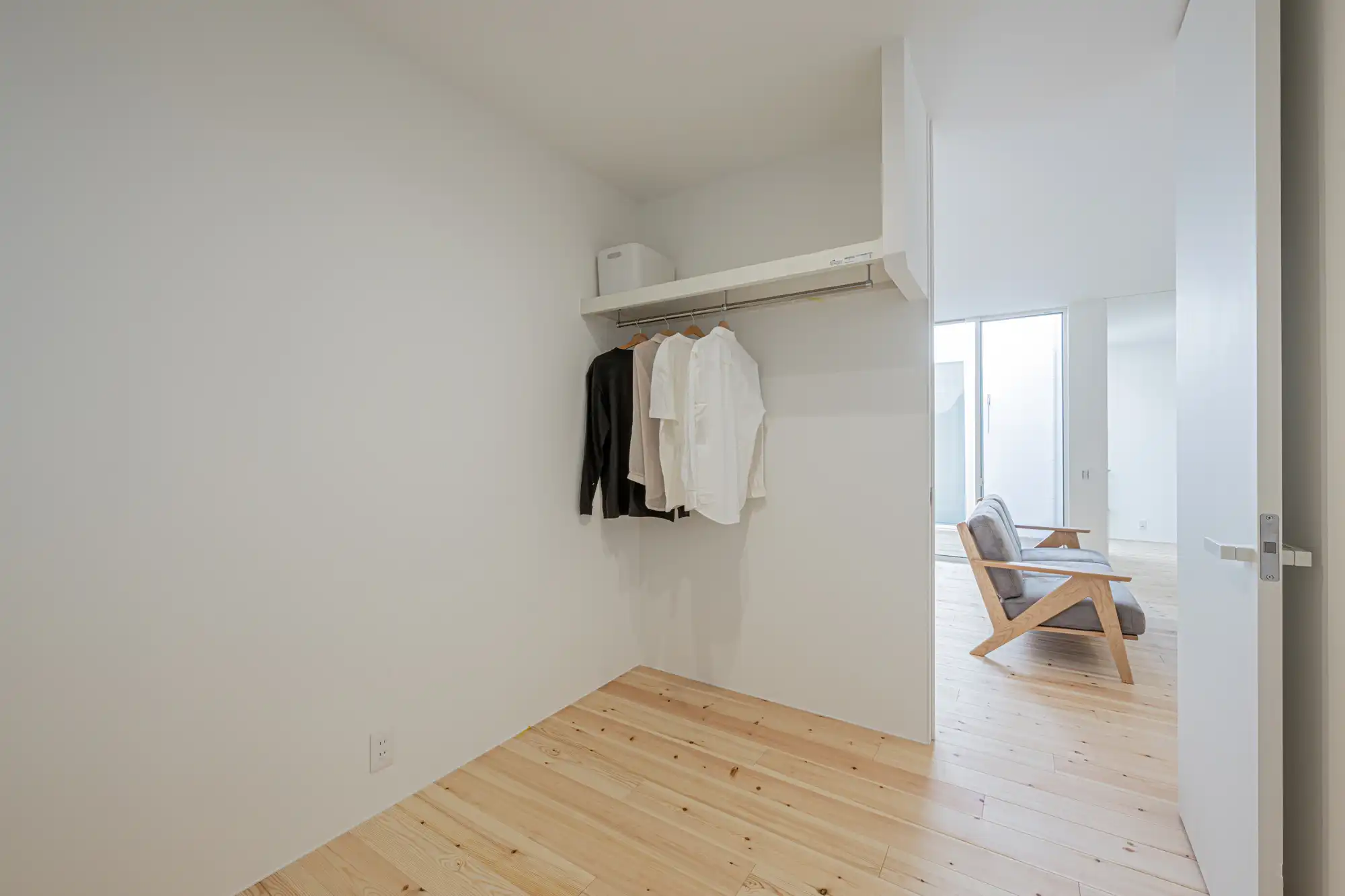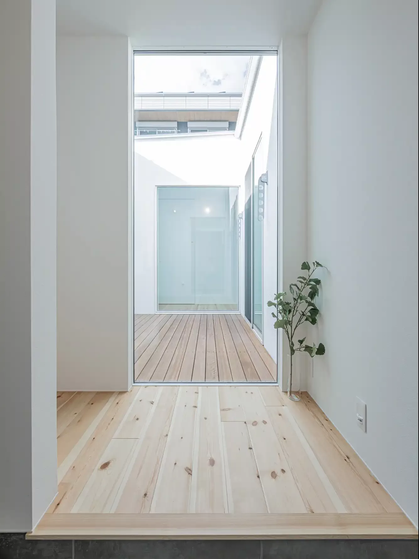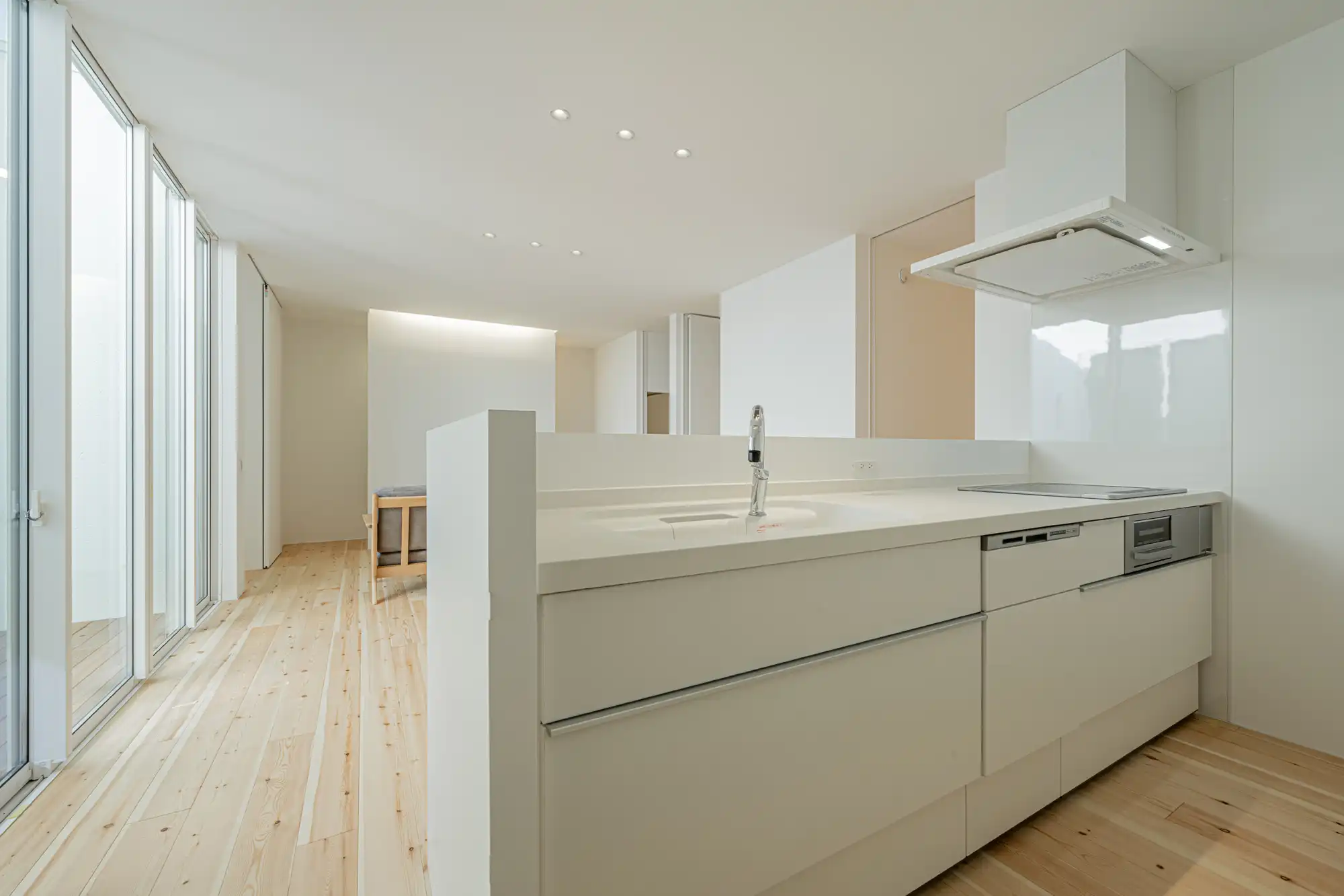 中庭を囲む無駄のないコンパクトな「ロの字間取り」が特徴で、高い建物に囲まれながらも、北側中庭からの反射光で家全体に明るさと開放感を享受できます。脱衣室から中庭、FCLへの動線により、短い洗濯動線を実現しました。外観は斜め壁がアクセントのSIらしい洗練されたデザインです。内装は白を基調に、パイン材が温かく映えるシンプルな家。ホームアーキの照明や間接照明で空間を演出するほか、生活感をさりげなく隠す玄関のカーテンも魅力的なポイントです。