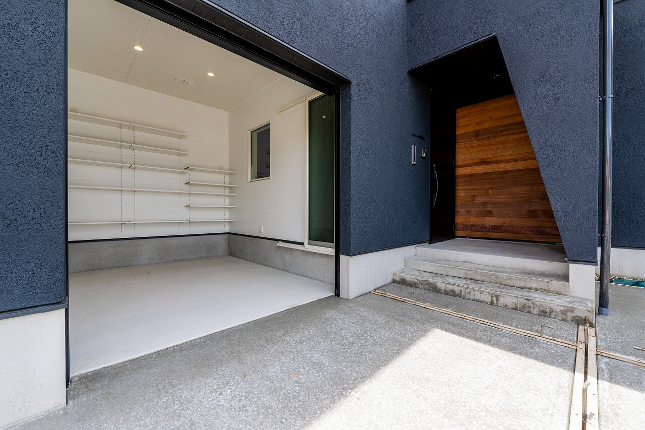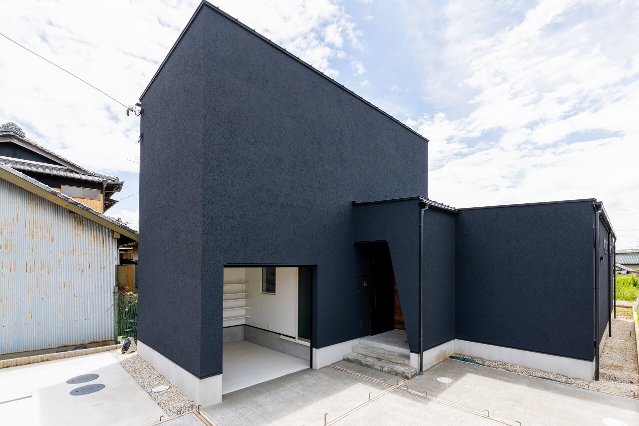 屋根・外壁・玄関ドア・ガレージシャッターなど黒で統一したシャープで存在感のある外観。
