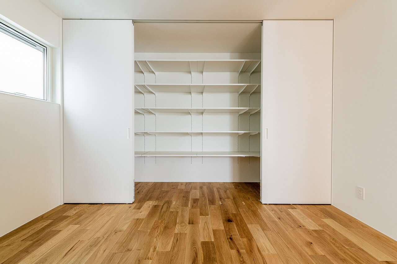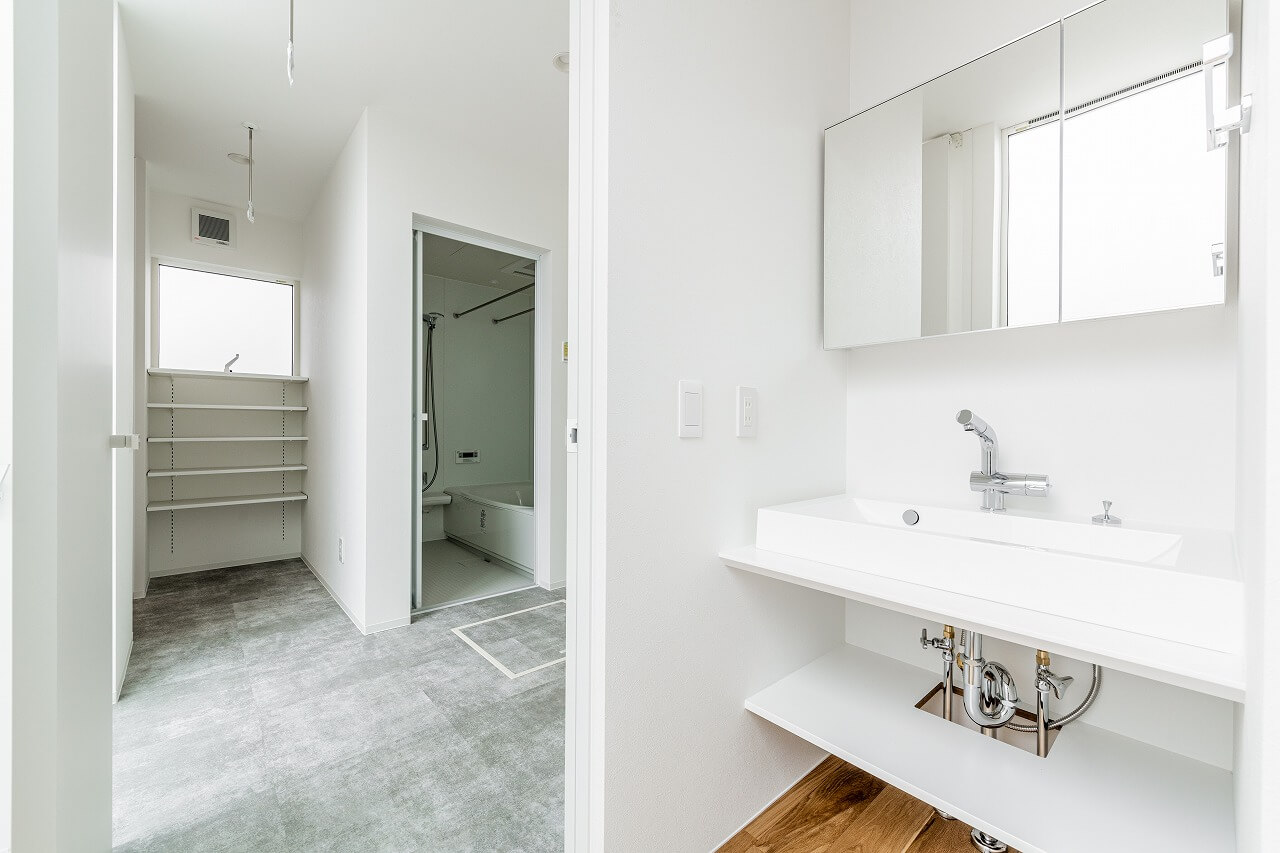窓のない外観は一見閉鎖的にも見えますが、清潔感のある白いガルバリウムの外観にすることで、柔らかなイメージを与え、親しみやい印象になります。